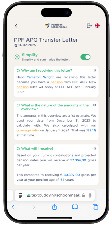 TextBuddy herschrijft complexe pensioeninformatie automatisch naar begrijpelijk B1-niveau. Zo begrijpen deelnemers daadwerkelijk wat er verandert, zonder verwarring of juridische ruis.